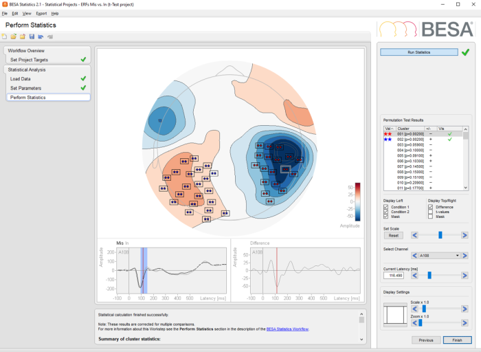 BESA Statistics 2.1 builds on earlier versions to provide a comprehensive suite of cross-subject statistical analyses of ERP/ERF data, source waveforms, images, time-frequency data, and coherence and connectivity values. Multiple comparison correction routines are built-in so the significance levels of your analyses are not over-inflated. This program can be used for statistical analyses independent of which pre-processing and analysis software you use for your EEG or MEG data.