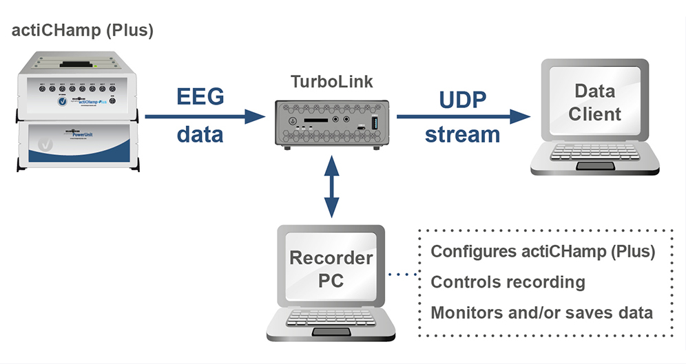Therefore, Brain Products has developed the TurboLink which allows for accessing and streaming EEG data from the actiCHamp (Plus) within less than 1.5 msec via User Datagram Protocol (UDP). You can choose to write your own software that captures and processes this UDP datastream, or you can use a commercial closed-loop data processing tool like sync2brain’s bossdevice RESEARCH with bossapp user interface.
